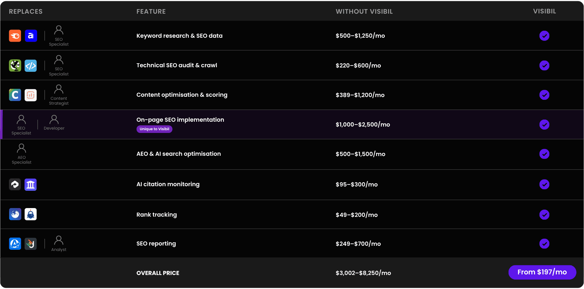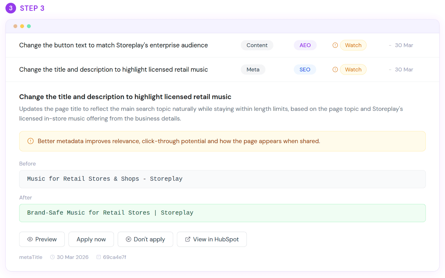 The SEO industry has built an entire category around generating recommendations that never get implemented. Visibil is built on the opposite assumption - that the implementation IS the product. Every change is written directly into HubSpot. No middleware, no JS overlays, no third-party dependency. Your content lives in your CMS and nowhere else.