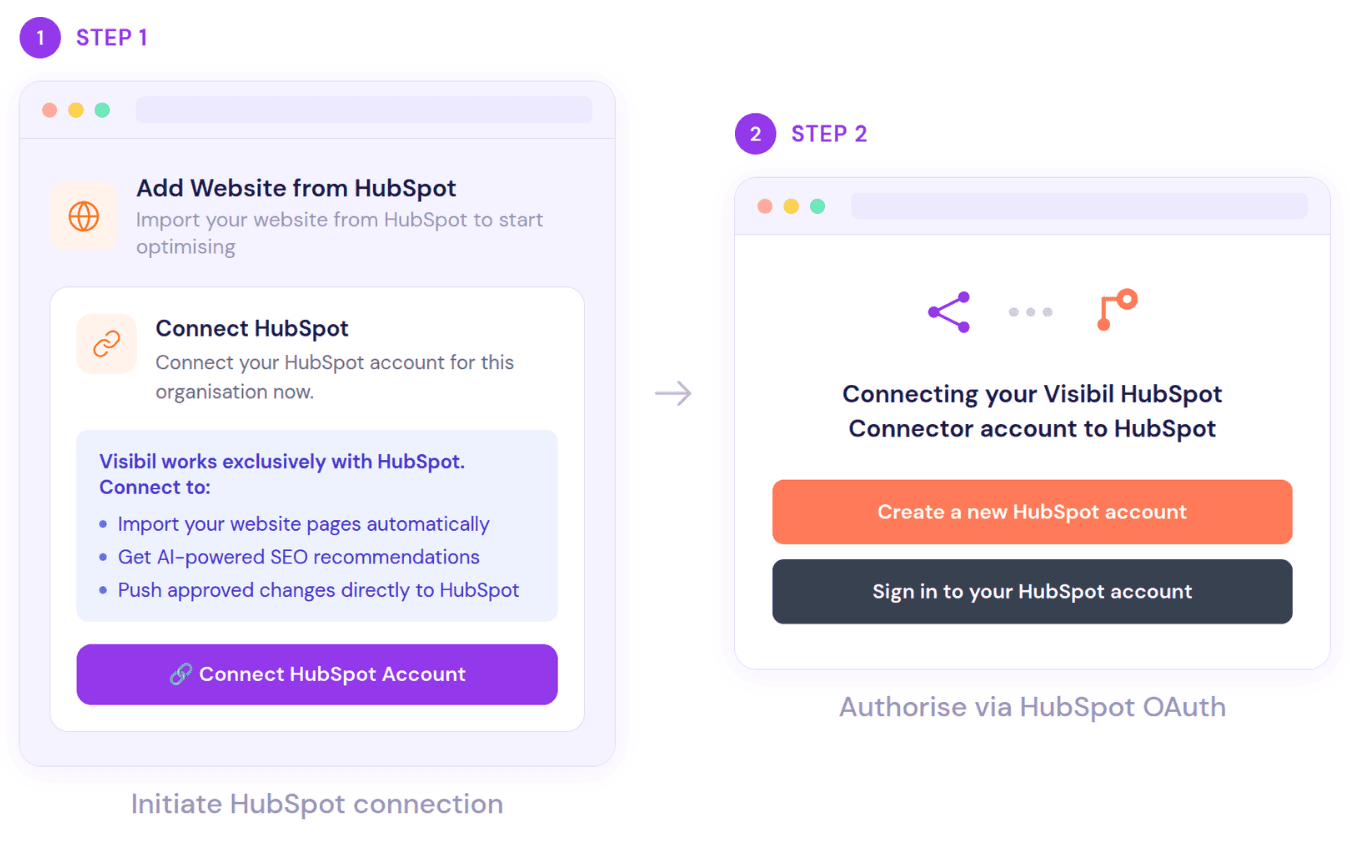 Install the Visibil connector from the HubSpot marketplace. One-click OAuth - no developer required, no code to touch. Once connected, Visibil pulls your full page catalogue and you select which pages to optimise. We handle the rest.