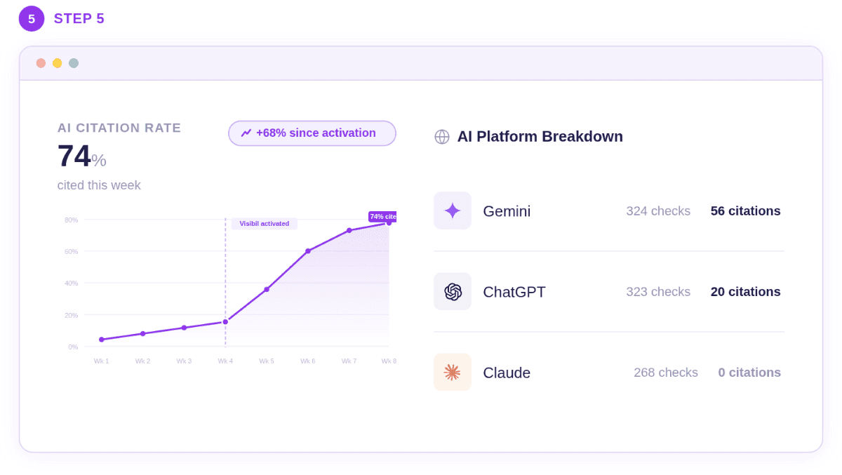 The live dashboard correlates every change Visibil made with your traffic and AI citation data. When performance moves - up or down - you see exactly why. When it dips, Visibil detects it and adjusts automatically.